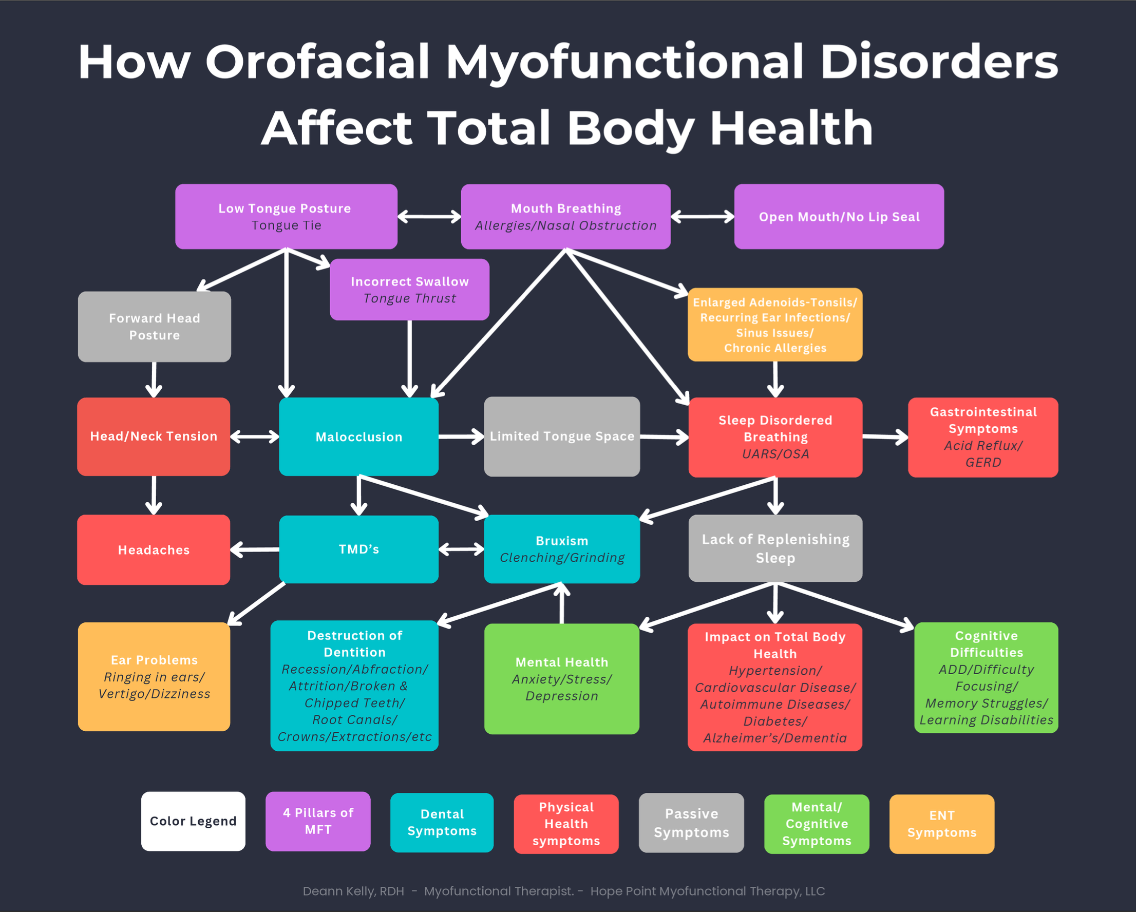 Mouth breathing → Poor tongue posture → Narrow palate & recessed jaw → Smaller airway → Sleep apnea → More mouth breathing